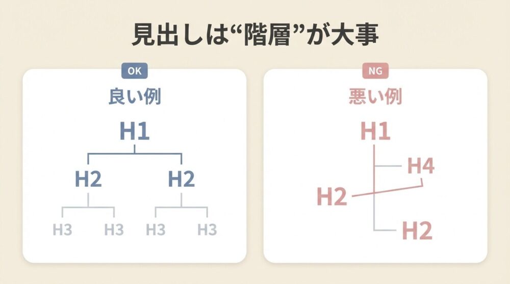 | 見出しがCSS目的でhタグを乱用 | ページ構造が崩れて意味が伝わりにくい | h1は1つ、h2→h3の順で階層化 |