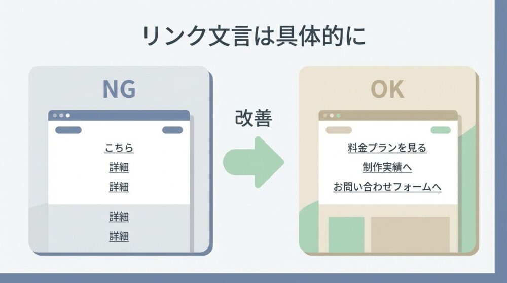 | 「こちら」リンクが多い | リンク先の内容が伝わらない | 「料金表を見る」「制作実績へ」など意味を入れる |