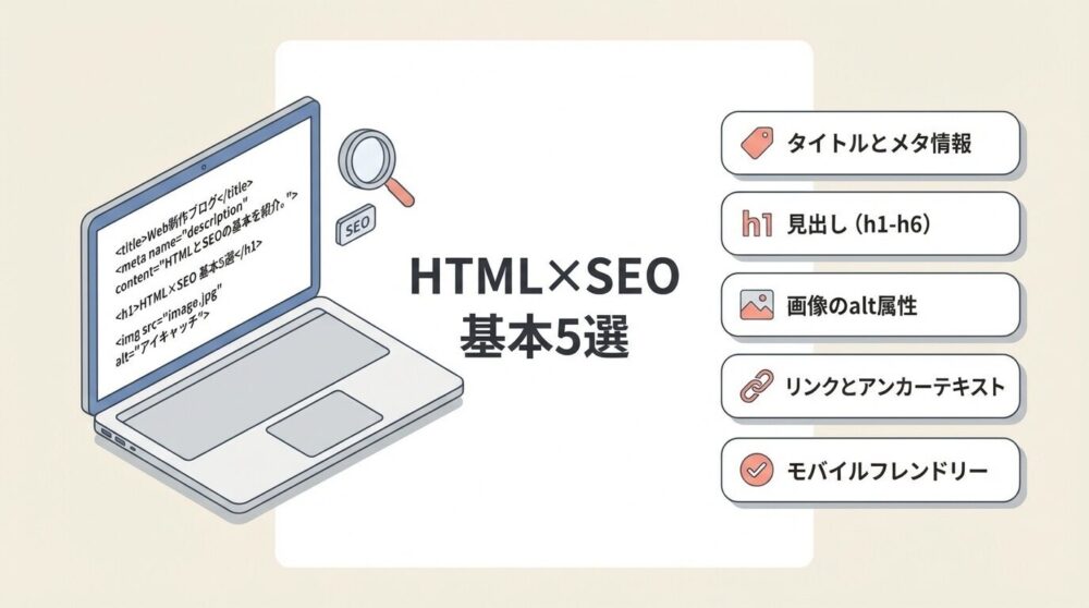 HTMLのSEO対策は、難しい理論よりも「検索エンジンに内容を正しく伝える」基本が大切です。初心者のうちは次の5つを実装できれば、コーディング品質が一段上がります。