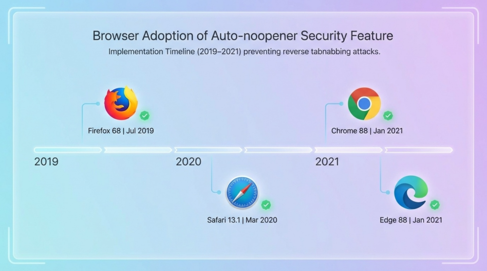 - 最新ブラウザ: 2021年以降は自動的にnoopenerが適用されるが、互換性のため明示的に書くのがベスト