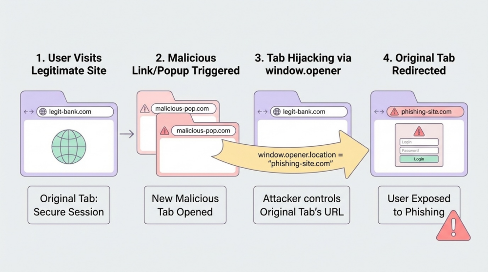window.opener.locationを使い、元のタブ(あなたのサイト)を偽のフィッシングサイトに書き換える - ユーザーが元のタブに戻ると、見た目が同じ偽サイトが表示されている